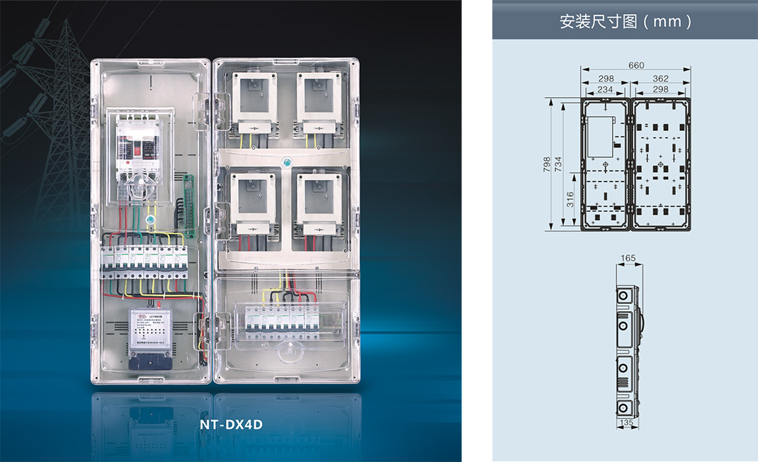 電表箱生產(chǎn)廠家-浙江南騰電氣有限公司研發(fā)的NT系列透明塑料電表箱,采用進(jìn)口聚碳酸酯(PC)和阻燃ABS工程塑料制成。具有抗沖擊、抗老化、耐腐蝕、透明度高、抗紫外線、安裝方便等優(yōu)點(diǎn),并且具有用電安全保護(hù),用戶分離控制,數(shù)據(jù)采集, 防盜電等功能。產(chǎn)品適合安裝電子式、機(jī)械式、智能IC卡預(yù)付式、智能多費(fèi)率式電表。南騰NT系列透明塑料電表箱自推出市場以來,憑借其完美的設(shè)計(jì)理念,在電表箱行業(yè)遙遙領(lǐng)先。
