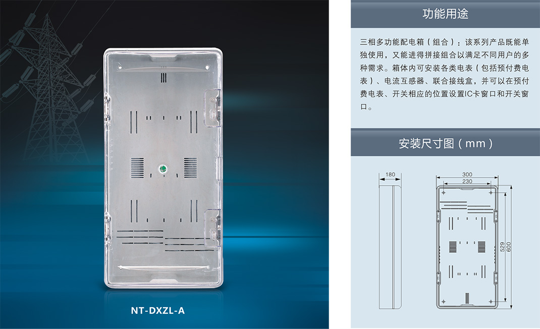 電表箱生產(chǎn)廠家-浙江南騰電氣有限公司研發(fā)的NT系列透明塑料電表箱,采用進口聚碳酸酯(PC)和阻燃ABS工程塑料制成。具有抗沖擊、抗老化、耐腐蝕、透明度高、抗紫外線、安裝方便等優(yōu)點,并且具有用電安全保護,用戶分離控制,數(shù)據(jù)采集, 防盜電等功能。產(chǎn)品適合安裝電子式、機械式、智能IC卡預(yù)付式、智能多費率式電表。南騰NT系列透明塑料電表箱自推出市場以來,憑借其完美的設(shè)計理念,在電表箱行業(yè)遙遙領(lǐng)先。