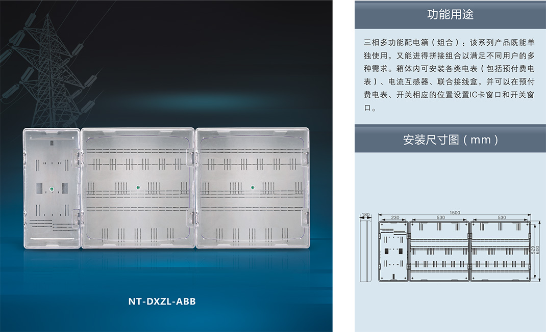 電表箱生產(chǎn)廠家-浙江南騰電氣有限公司研發(fā)的NT系列透明塑料電表箱,采用進(jìn)口聚碳酸酯(PC)和阻燃ABS工程塑料制成。具有抗沖擊、抗老化、耐腐蝕、透明度高、抗紫外線、安裝方便等優(yōu)點(diǎn),并且具有用電安全保護(hù),用戶分離控制,數(shù)據(jù)采集, 防盜電等功能。產(chǎn)品適合安裝電子式、機(jī)械式、智能IC卡預(yù)付式、智能多費(fèi)率式電表。南騰NT系列透明塑料電表箱自推出市場(chǎng)以來,憑借其完美的設(shè)計(jì)理念,在電表箱行業(yè)遙遙領(lǐng)先。